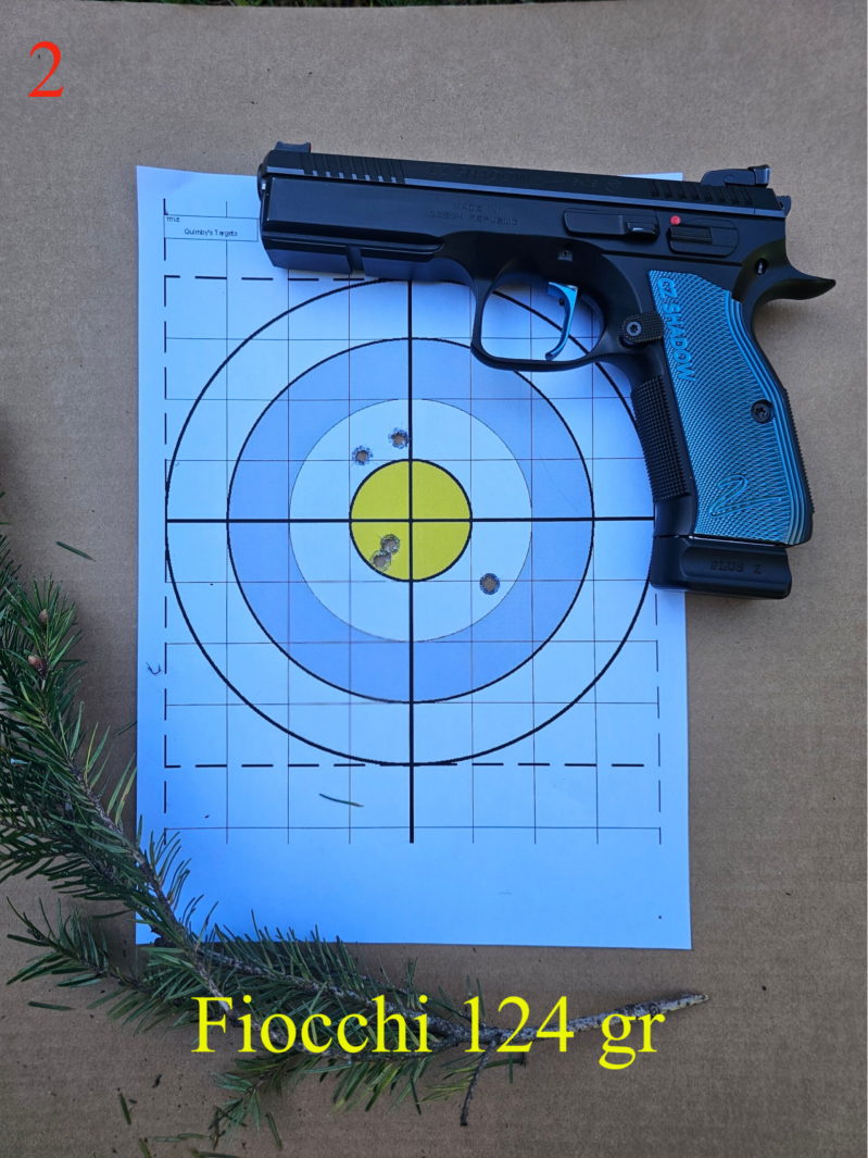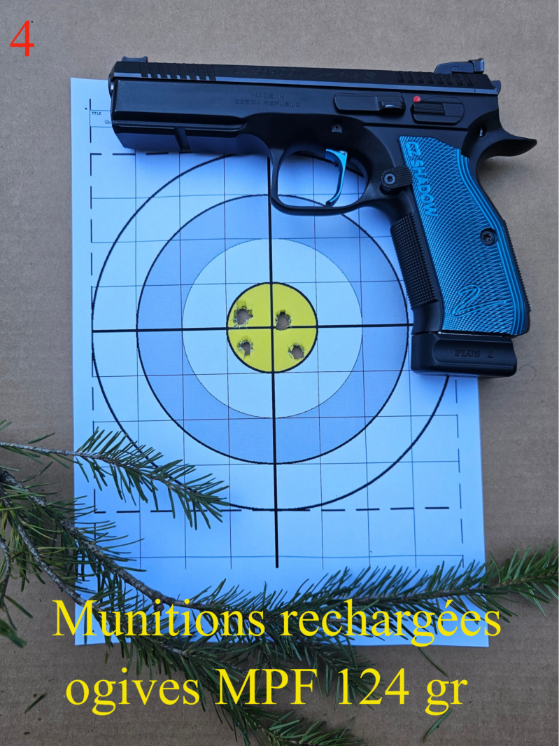 Sur la 2, j'utilise la Fiocchi en 124 gr, et, on est quasi en point visé point touché. Sur la numéro 3, la munition coréenne PMC bien qu'en 115 gr, montre un groupement correcte, les deux impacts hors du centre ne sont certainement du qu'à mon fait, et non pas à l'arme ou à la munition.