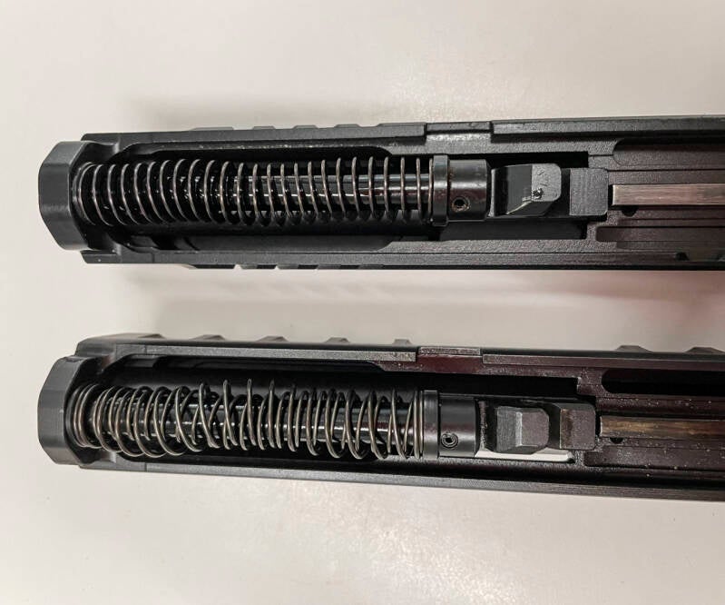 Une autre nouveauté sur la glissière est le revêtement Aqua Tech exclusif de Beretta. Cette finition a été développée pour répondre aux exigences militaires et est censée être plus résistante à la corrosion qu'un revêtement nitrure conventionnel. Ce revêtement est présenté comme un autre exemple de l'ingéniosité italienne. Le canon, qui bénéficie également de l'Aqua Tech, reste forgé à froid par martelage, mais le ressort de recul comporte désormais un seul ressort plat au lieu du double ressort de l'original.